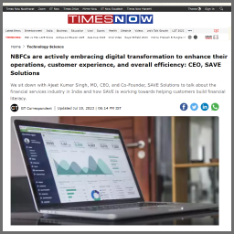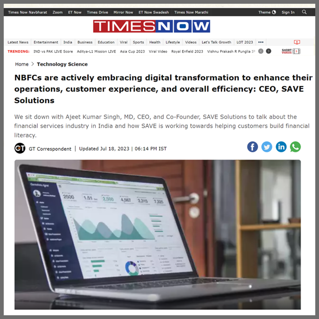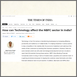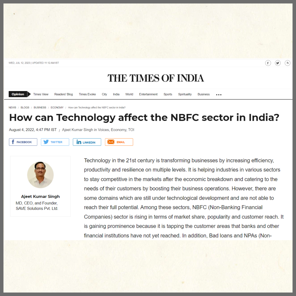 An article titled ‘How can Technology affect the NBFC sector in India?’ by SAVE Group’s MD, CEO, Co-Founder Mr. Ajeet Kumar Singh in Times of India.