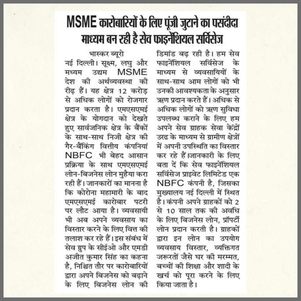 National Hindi daily newspaper Dainik Bhaskar published a news piece about SAVE Financial Services' Secured & Unsecured loans.