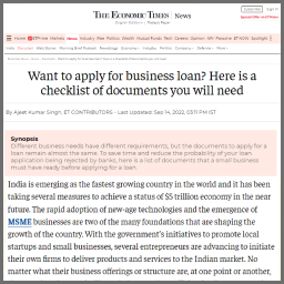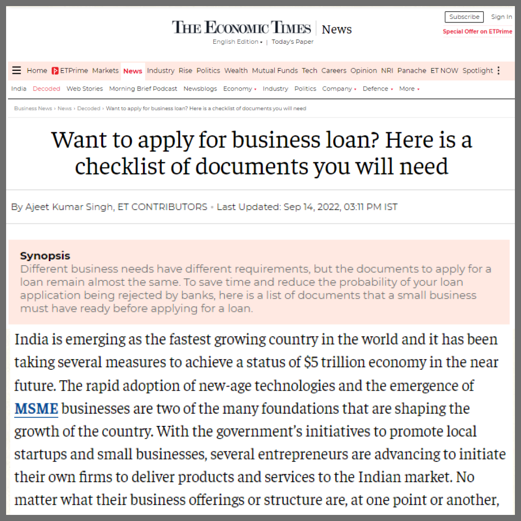 Article titled ‘Want to Apply for Business Loan? Here is a Checklist of Documents you will Need’ by Mr. Ajeet Kumar Singh in the Economic Times.