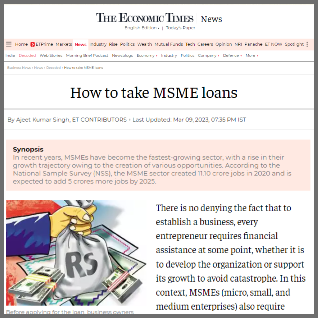 Economic Times featured an author article by SAVE’s MD on “How to Get MSME Loans”.