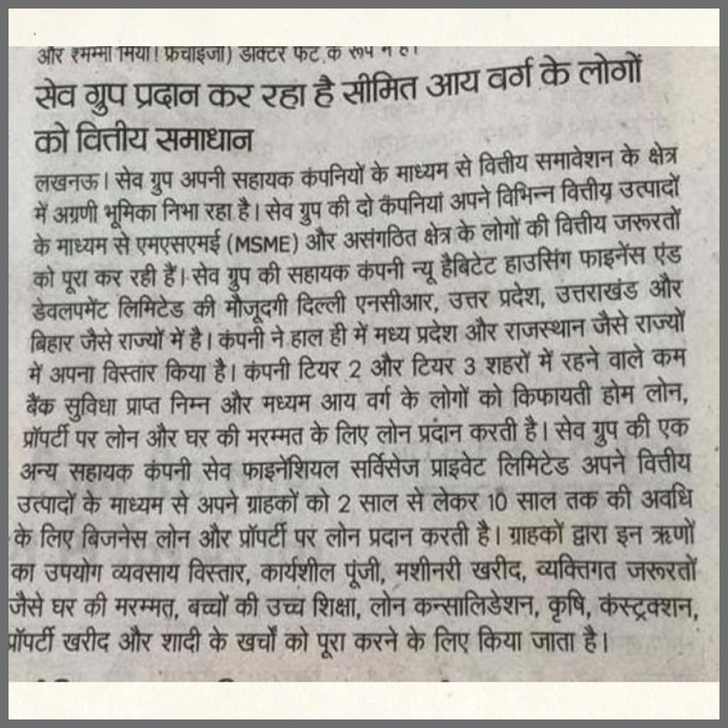 National Hindi Daily Newspaper Dainik Bhaskar covered a news piece on SAVE highlighting the Loan Products and Services of SAVE Financial Services and New Habitat Housing Finance and Development Limited.